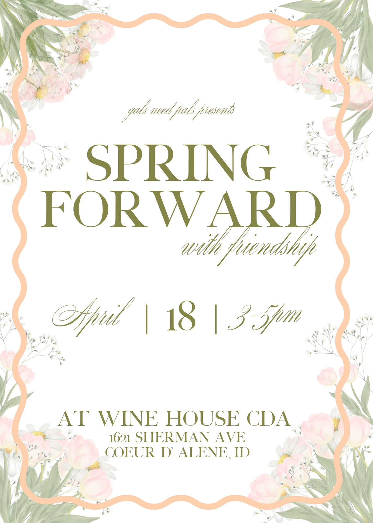 Spring is a time for growth and new beginnings, so join us in creating new connections on April 18th at the Wine House CDA. We want this event to be a time for you to embrace old and new friendships while gathering around food, drink, and great company.
